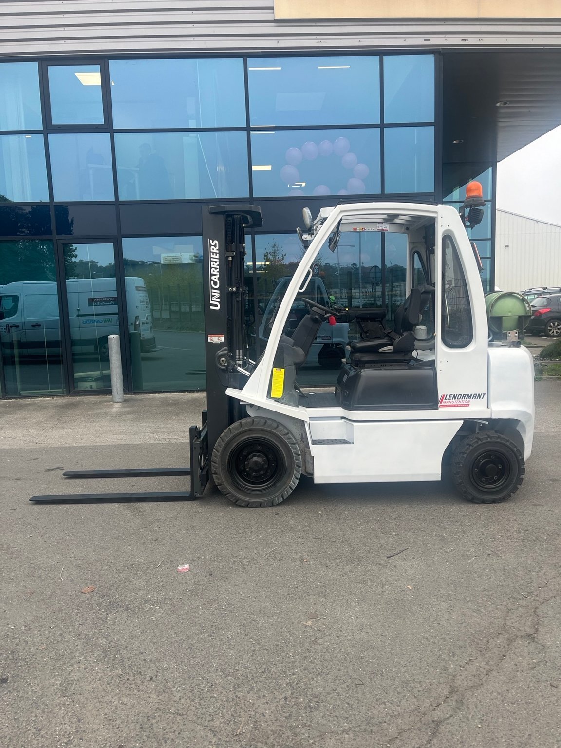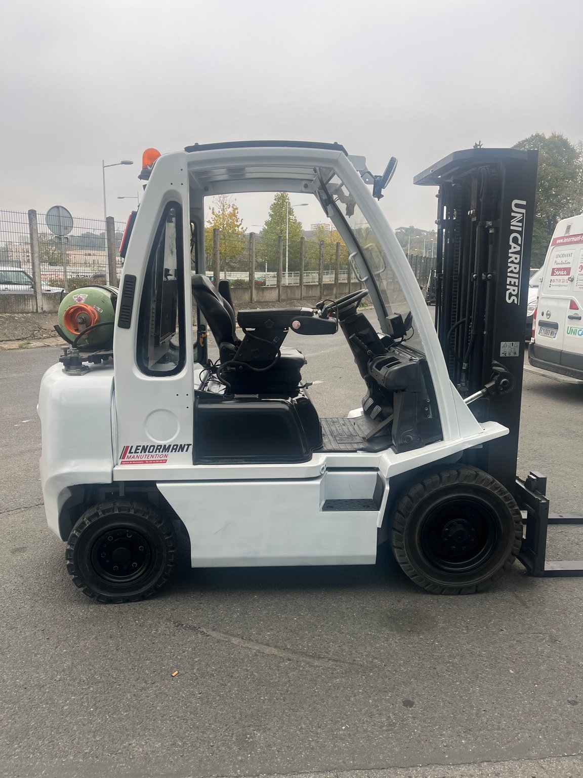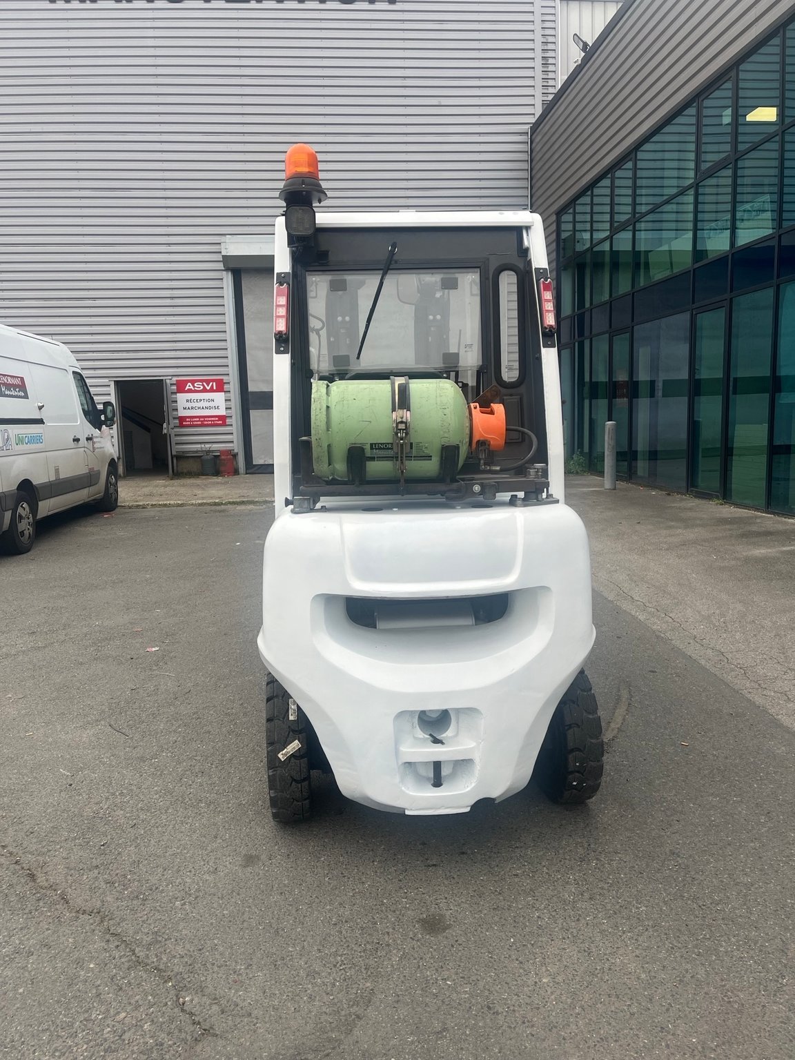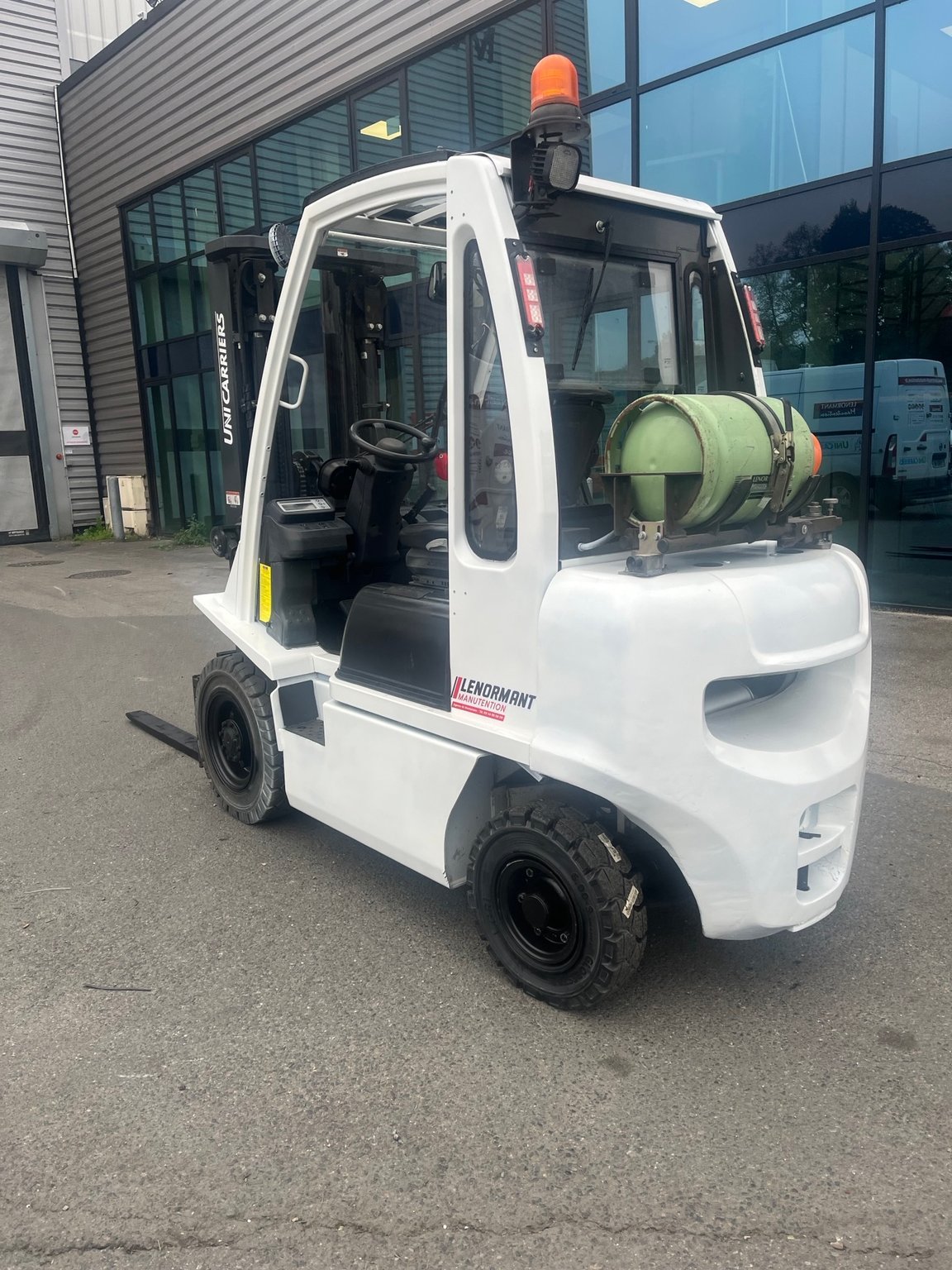 Chariot frontal Gaz capacité 2500 kg - Mat Triplex 4750/2145/1510 mm - TDLI - mini leviers - feu à éclats - Pack signalisation LED - pare brise avant arrière et toit - Support bouteille basculant