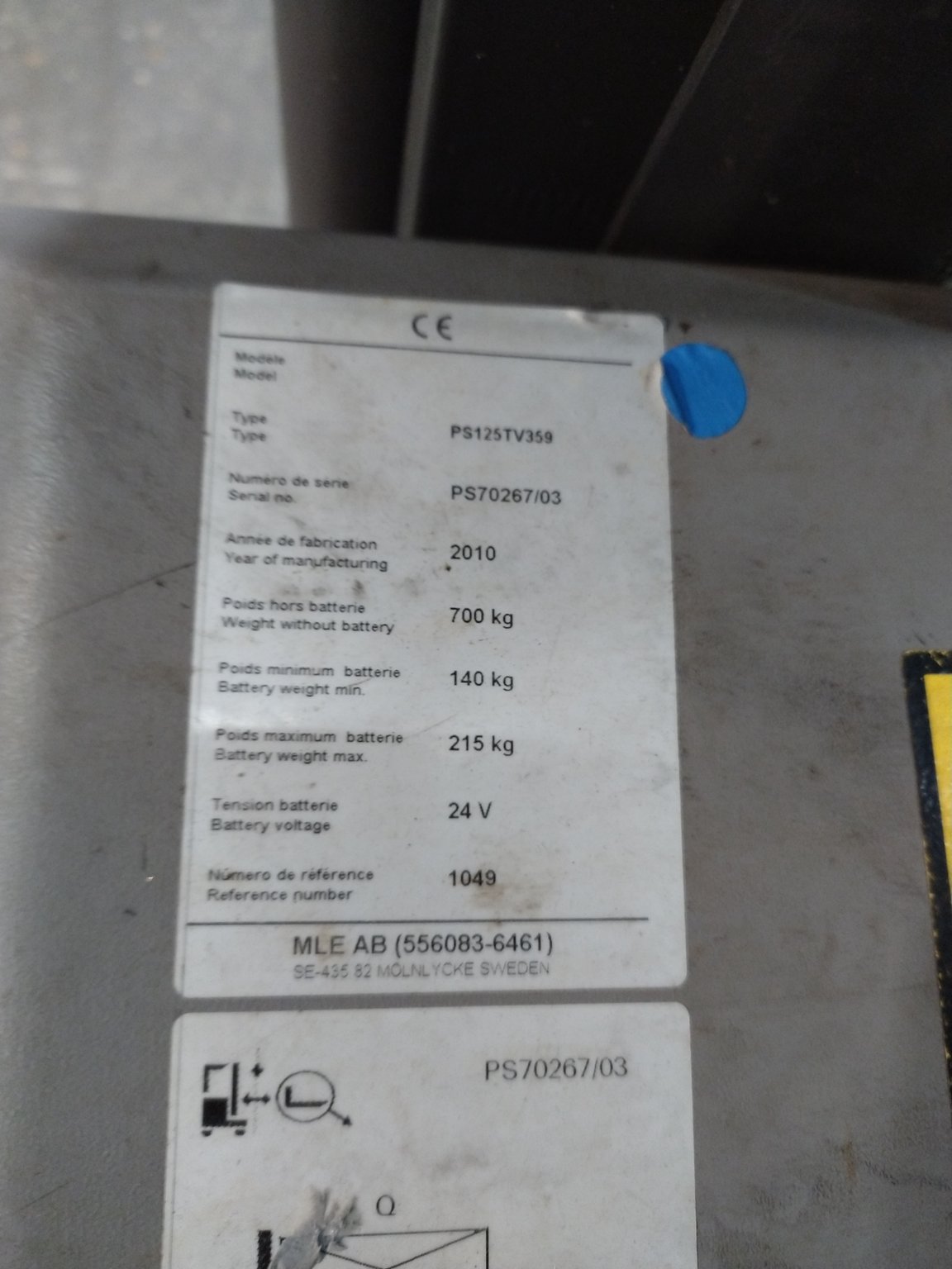 Gerbeur Electrique capacité 1250 kg - Mât Duplex 3590/2300/170 mm - fourches 1200 mm - Batterie neuve 24 volts 230 ah - Chargeur mural - pas de peinture.