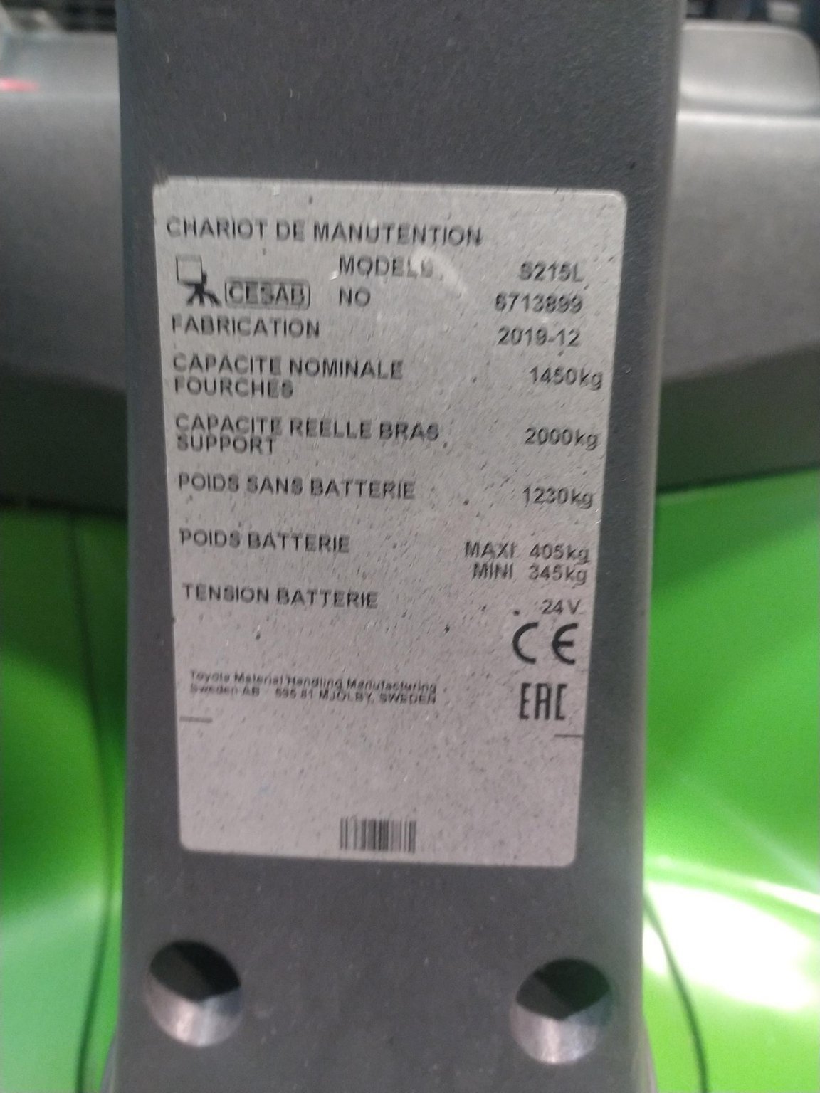 MarqueCESABHauteur de levée2.7Capacité de levage1200ÉnergieÉlectrique