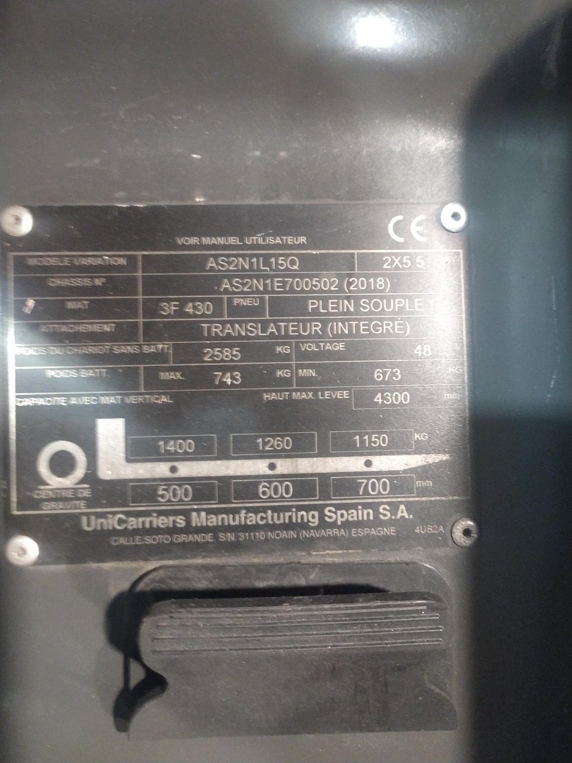 MarqueUniCarriersHauteur de levée7.25Capacité de levage1400ÉnergieÉlectrique